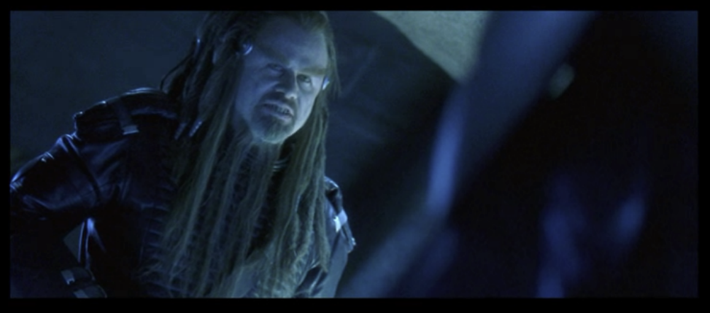 To hell with it. Here’s the deal Frank: I seriously can’t tell you what happens in this movie with any great detail or coherency, because the movie itself lacks those things. So here’s the vaguest of gists: Barry Pepper ends up in human prison, and while attempting to escape he impresses John Travolta (who spent his own money to make this movie), who is playing one of the totally bizarre-looking aliens (they’re called Psychlos, but that is too stupid for me to type more than once so I am just going to call them aliens) who brought about the ruin of human civilization all those years ago.