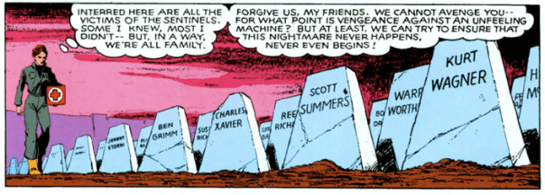 “Days of Future Past” bears the mark of being an early example of this sort of narrative within the comics world, and it does lack the complexity of other “we must return to the past to save the future!” stories to come. (Technically, James Cameron should have paid off a lot more people after The Terminator.)