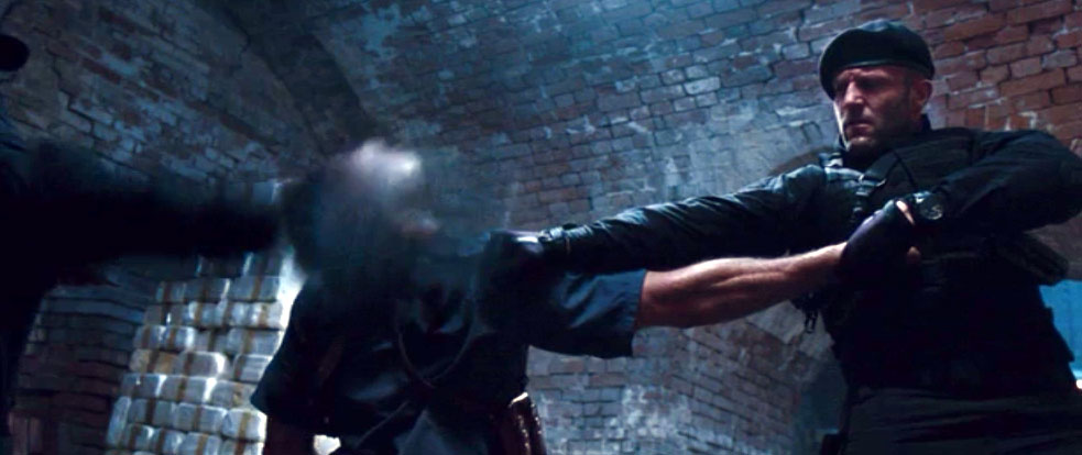 Stallone and Statham get back and tell the team that the job is too dangerous and they’re not gonna do it. And then Statham goes back to Cordelia’s house because he won’t take no for an answer — but Cordelia’s glad to see him because she’s got a big ol’ bruise on her face from that douchebag she’s sleeping with instead of Statham did I already mention that I don’t understand how she could do that?