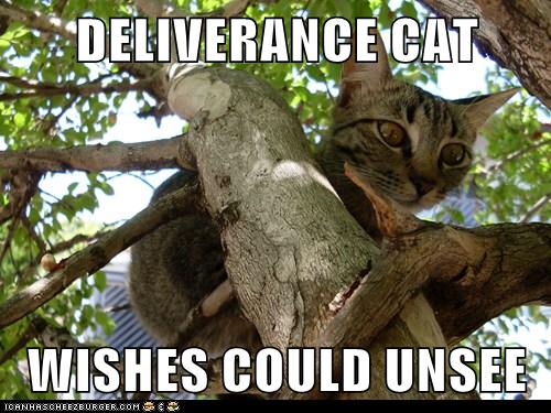 Oh, shit! Oh shit! This is actually really awful! They wrap Jon’s belt around his neck to tie him to a tree and make Ned take off his clothes and jesus christ, they’ve got a knife held up to Jon and the whole thing is so awfully casual. Ned tries to run, but one of the hillbillies catches him and starts to ride him like a pony and the squeal piggy squeal isn’t a one-off line, it’s an extended moment, where Ned is brutally humiliated and penetrated in the dirt and Jon is trying not to watch and so am I and I’m going to stop describing this scene in detail.