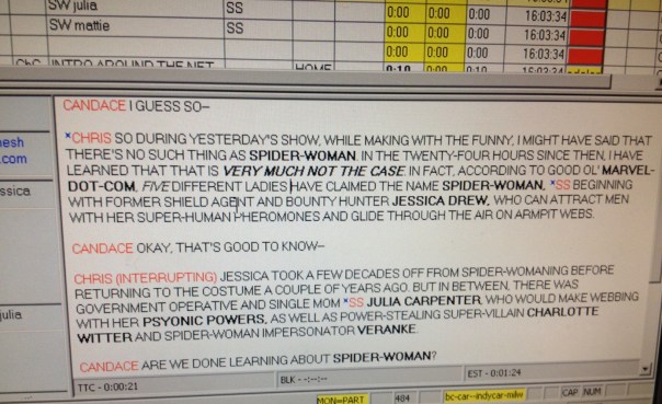 Here is a real-life example of iNews in action! It is a for-real program used in making live television. In this instance, it is being used to tell the world about Spider-Woman.